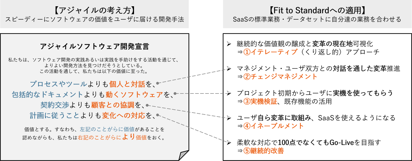 シグマクシスは2001年に米国で発表された「アジャイルソフトウェア開発宣言」が掲げる4つの価値観「プロセスやツールよりも個人と対話を」「包括的なドキュメントよりも動くソフトウェアを」「契約交渉よりも顧客との協調を」「計画に従うことよりも変化への対応を」をFit to Standardに適用することで、迅速かつ確実にSaaS導入の価値を提供します。
