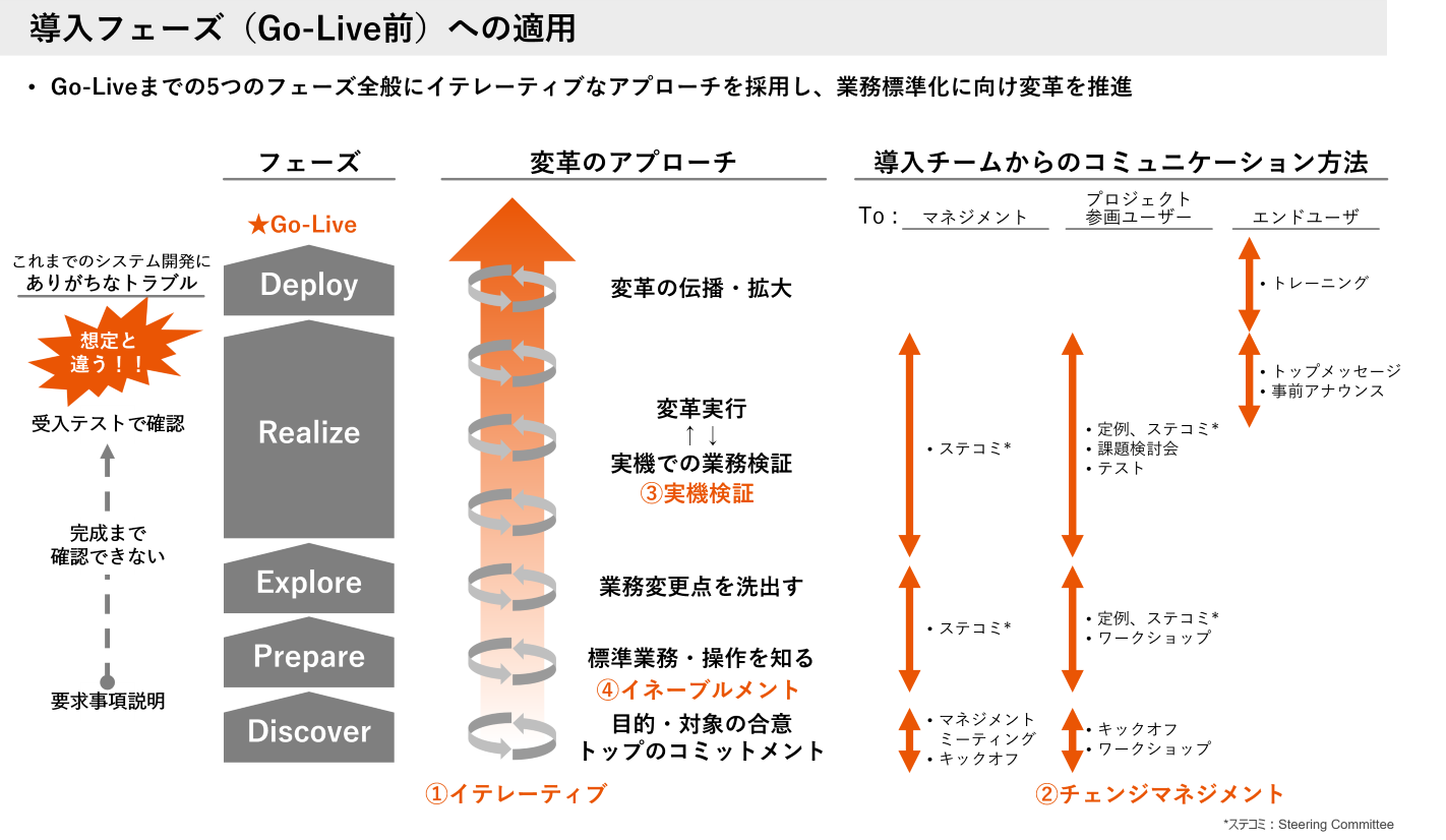 - Deploy(伝播と移行): 本番稼働に向けて業務・データ・システムを移行します。運用マニュアルや体制を整え、プロジェクトメンバーが中心となって変革を全社へと展開します。