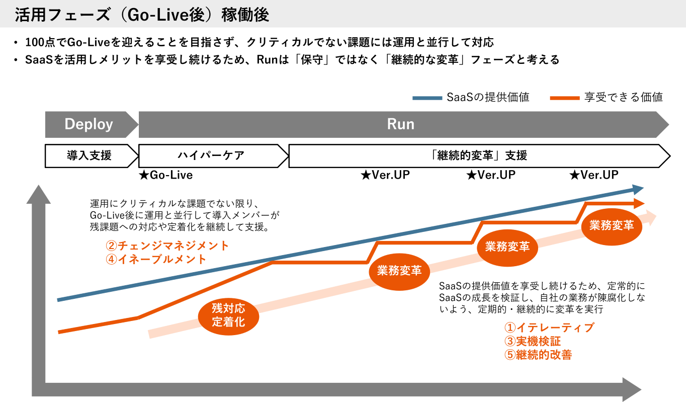 柔軟な対応で本番稼働を目指し、クリティカルでない課題には本番稼働後の活用と並行して対応します。本番稼働後の活用フェーズにおいては、SaaSのバージョンアップに合わせた業務変革を、「保守」という概念ではなく「継続的な変革」として捉え、SaaSの進化に能動的に対応します。お客様のビジネス価値を最大化するパートナーシップを構築し、継続的な価値提供を実現します。