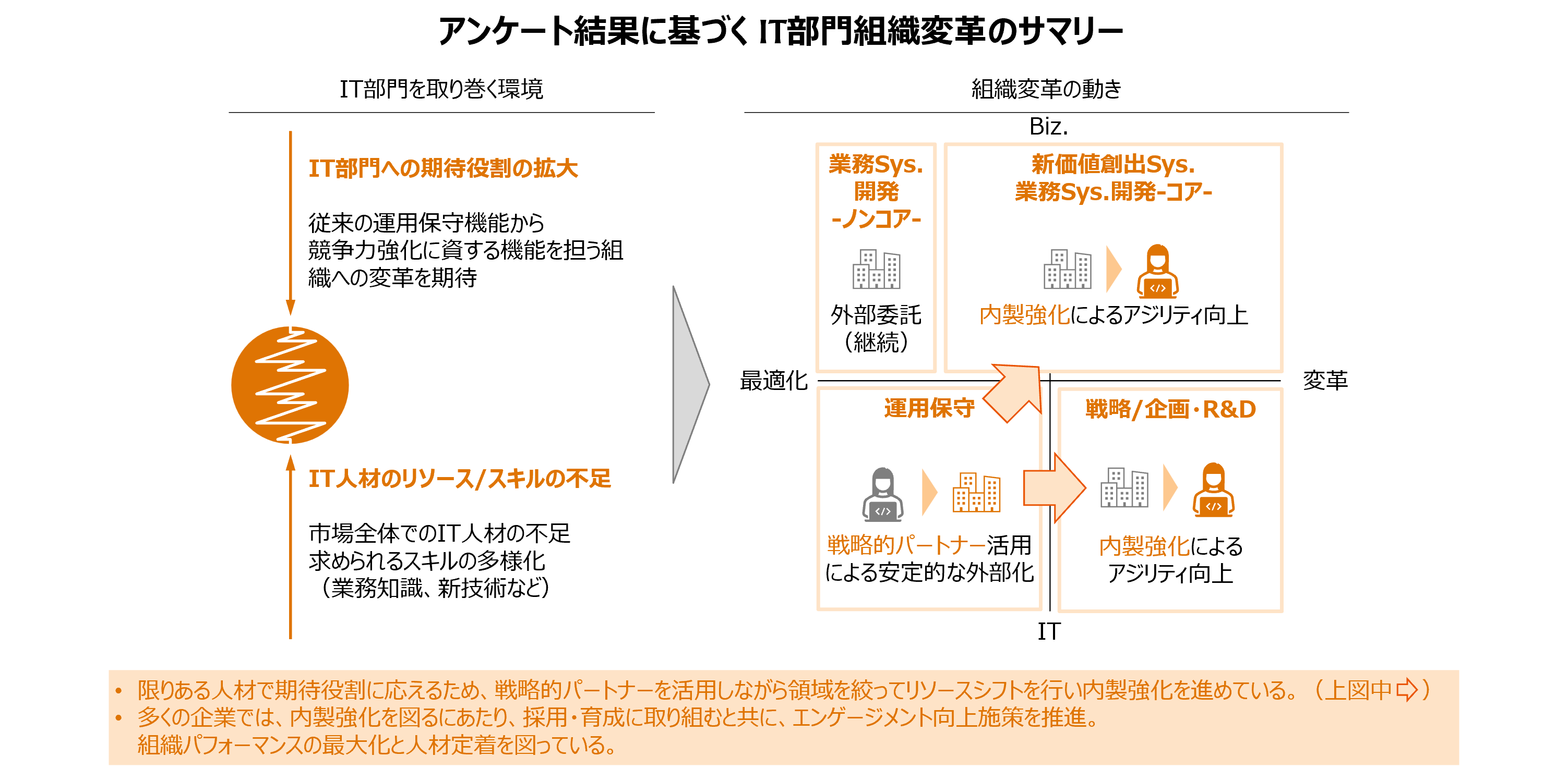 アンケート結果から、IT部門を取り巻く環境と組織の現状・課題を紐解き、今後の組織変革に向けた方向性をまとめました。